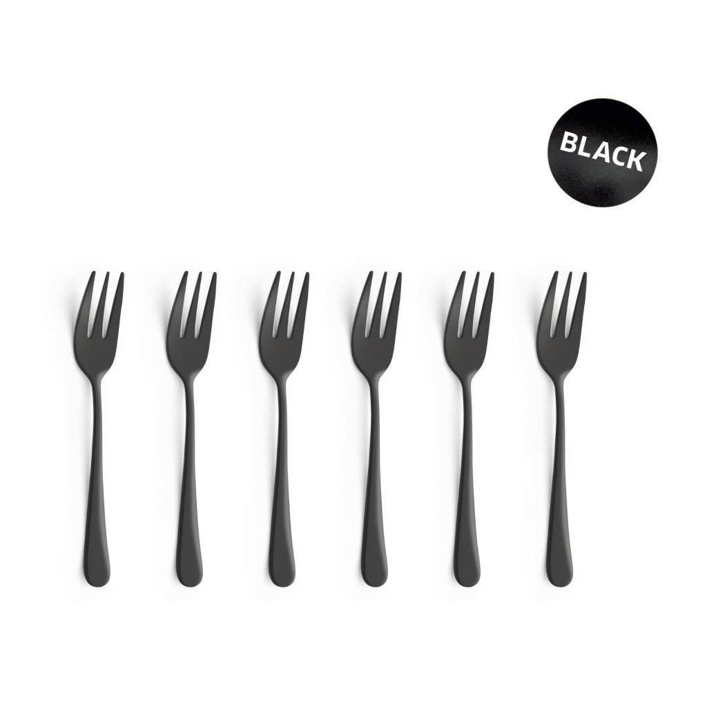 Een set van 6 stuks gebaksvorkjes. Niet geschikt voor in de vaatwasser. Voorkeur om met de hand te wassen voor het behoud van de kleur en glans. Lengte: 14 cm. Materiaal: 18/0 chroomstaal. Kleur: zwart.
