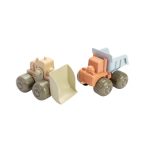 Stoere voertuigset van Dantoy, met een bulldozer en een vrachtwagen in ingetogen, natuurlijke kleuren. Ze passen