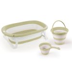 De set bestaat uit een opvouwbaar badje, een emmer en een beker. Het maakt badderen voor baby’s een stuk makkelijker. Dankzij het opvouwbare ontwerp is het gemakkelijk mee te nemen, zelfs op reis. Wanneer het niet in gebruik is, kan het compact worden opgevouwen.