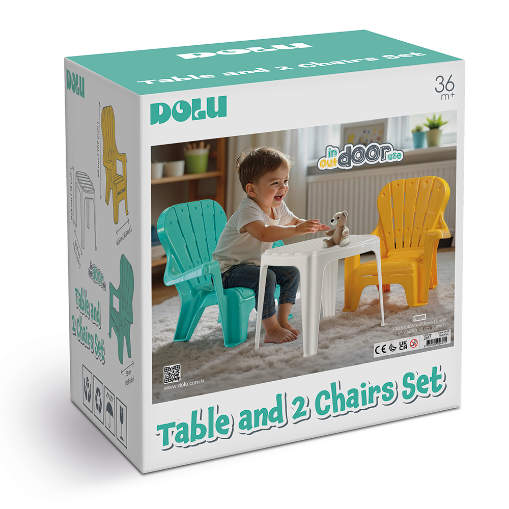 Met deze Dolu Tafel met Stoeltjes heeft jouw kindje een eigen plekje om in de tuin te spelen of te genieten van het lekkere weer. Vaak kunnen ze niet zelfstandig op een grote mensen stoel klimmen of kunnen de kinderen nog net niet bij de tafel. Met deze set heeft jouw kindje hier geen last meer van en kan hij of zij zelfstandig aan tafel aan zitten of juist van tafel af gaan. De set bestaat uit een tafeltje met 2 stoeltjes.