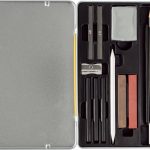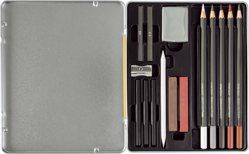 Inhoud: 1 tekenpotlood 8B, 3 x geperst houtskool ( soft, medium en hard), 1 kneedgum, 1 doezelaar, 1 metalen puntenslijper, 2 x pastelkrijt (kleur :sanguine gebrand en van Dyck bruin), 2 grafietpotloden (4B en 6B) en 5 kleurpotloden in de kleuren wit, walnootbruin, bloedrood, warmgrijs en donker sepia. De potloden hebben een kerndiameter van 3,8mm.