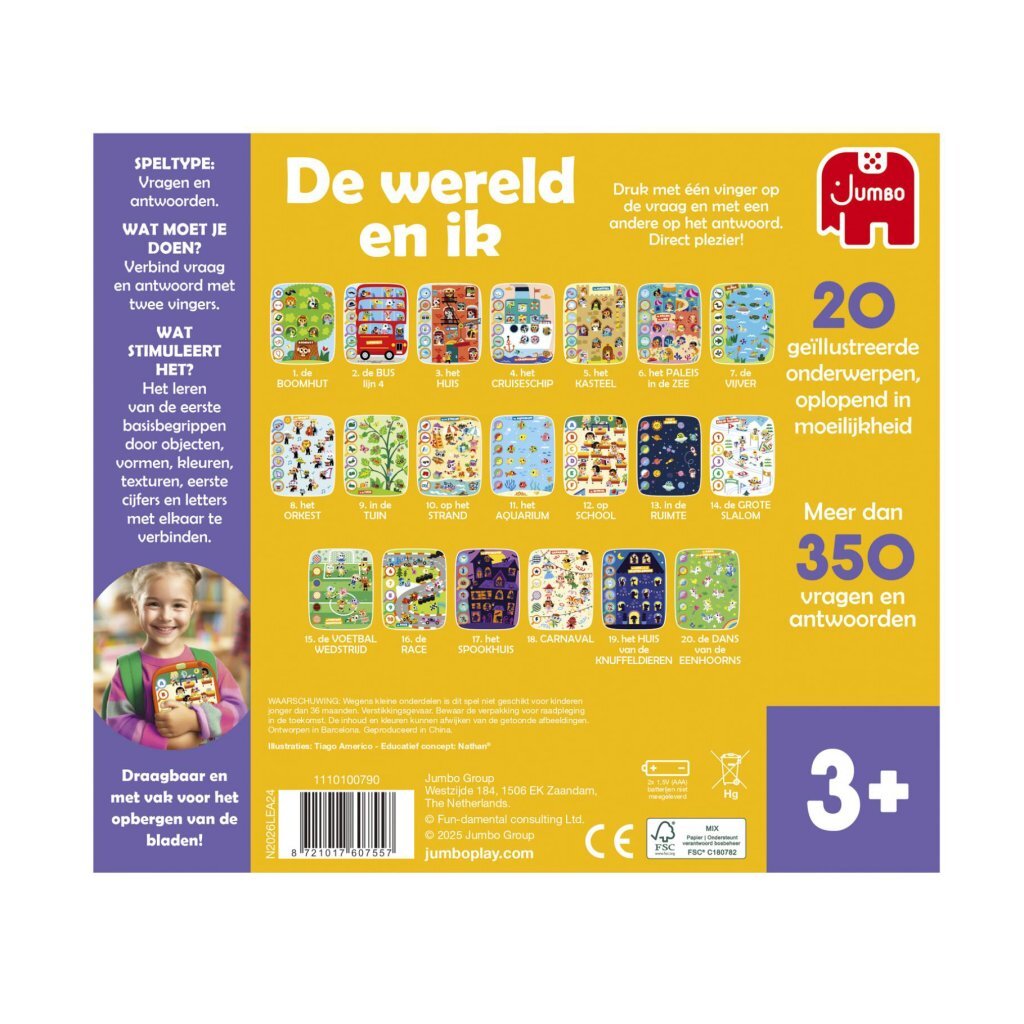 Met Jumbo Electro Touch & Learn De Wereld En Ik zullen kinderen plezier beleven en hun observatie, visuele vermogen en herkenning van vormen ontwikkelen. Om te spelen druk je met één vinger op de vraag zoek je met een andere vinger het juiste antwoord. Afhankelijk van het onderwerp van het blad kunnen sommige vragen meer dan één juist antwoord hebben. Let op: er kunnen ook foute antwoorden zijn. De bladen zijn genummerd in volgorde van oplopende moeilijkheidsgraad. Door te spelen leren kinderen regels te respecteren en hun sociale vaardigheden te ontwikkelen. Ouders en opvoeders kunnen, naast uitleggen hoe het spel werkt, ook uitstekende medespelers zijn en de educatieve waarde van het spel verhogen. Geschikt voor kinderen vanaf 3 jaar.