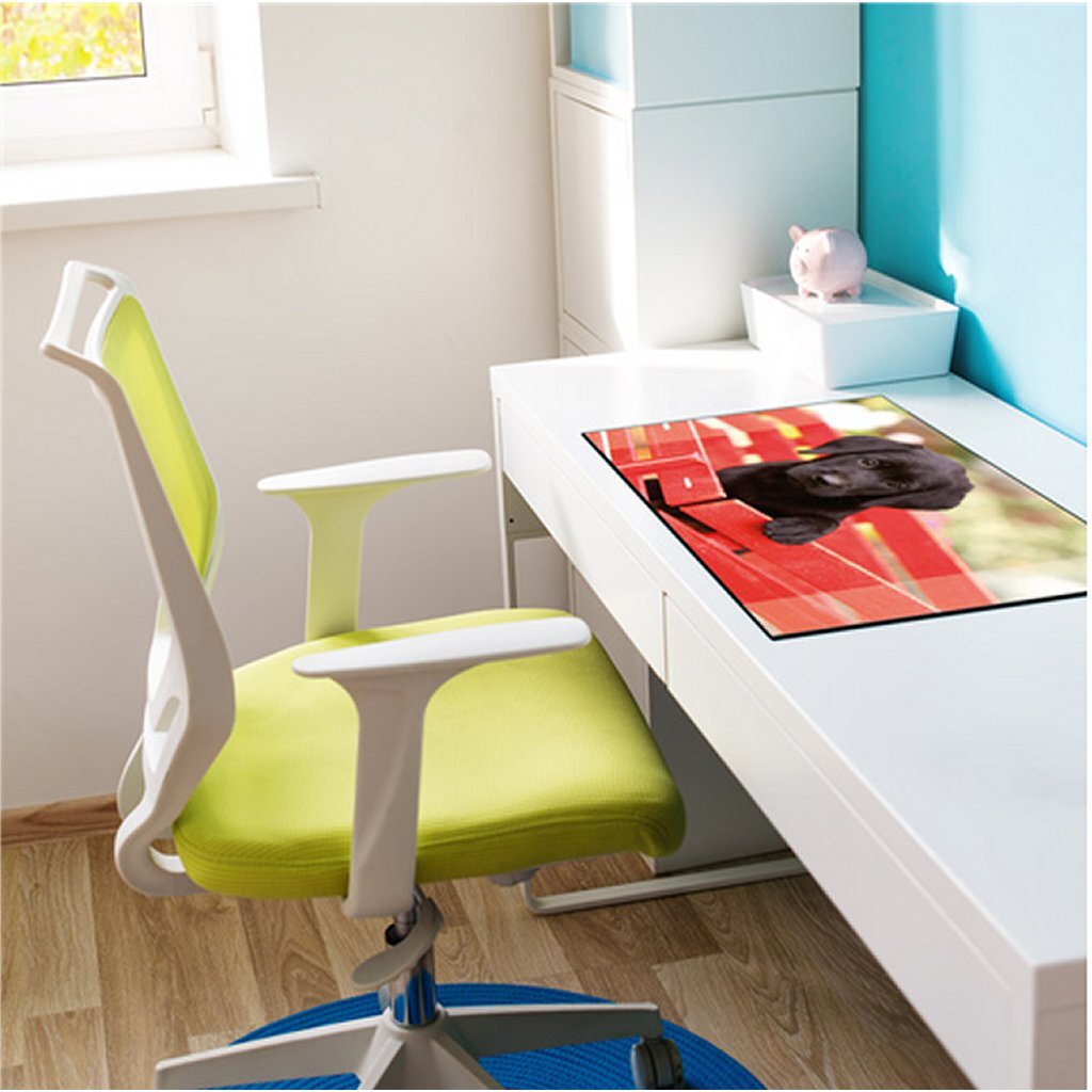 Soepele PP bureau-onderlegger met fraai dessin. Formaat 38×58 cm. Dessin zwarte labrador pup. Met anti-slip achterkant. 100% recyclebaar.