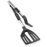 Twee-in-een: bespaart tijd en bovendien ruimte in je keukenla. De Leifheit bakspaan/serveertang 2-in-1 uit de serie ProLine is precies wat je nodig hebt bij het bakken en braden. Voor het omdraaien van een biefstuk gebruik je de bakspaan. En je maakt van de bakspaan heel snel een praktische tang voor handig serveren. Dankzij het innovatieve vastzetmechanisme: je opent met je duim de vergrendeling en je bakspaan verandert in een serveertang. De kop van de tang is van elastisch nylon en is hittebestendig tot 160 °C. Veilig te gebruiken in pannen met antiaanbaklaag, zonder angst voor krassen. De handgreep is van roestvrij staal en ligt prettig en stabiel in de hand.